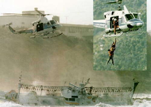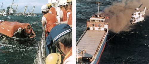 ![]() <巡逻船急赴遇难外国船舶,实施现场救助工作/海上保安厅直升飞机到达火灾船舶,实施现场救助工作>