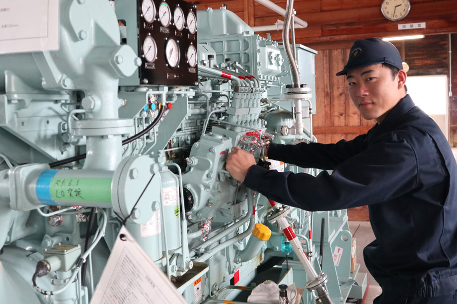小さい頃から、車や鉄道といった乗り物やプラモデル、自転車の整備など機械いじりが好きだったこと、高専で5年間機械のことを学んだこともあり、自分の得意な分野で働きたいと考え、機関コースを選びました。