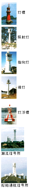 船舶が陸地、主要変針点又は船位を確認する際の目標とするために沿岸に設置した構造物及び港湾の所在、港口等を示すために港湾等に設置した構造物で、灯光を発し、構造が塔状のものを灯台という。 |